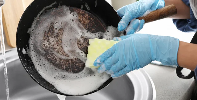Эффект вас просто ошеломит — нагар станет очень мягким, его можно будет легко убрать с помощью жесткой губки для мытья посуды. После такой чистки сковорода выглядит как новая.
