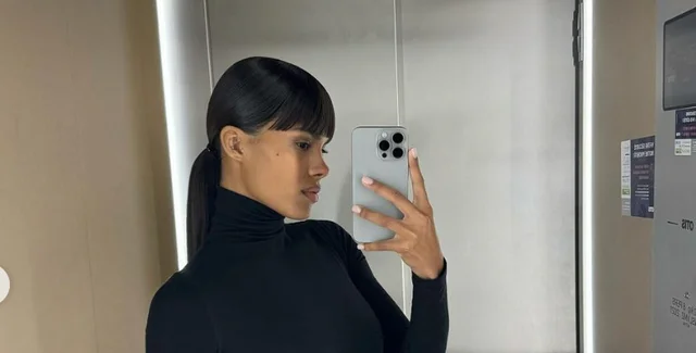 Звезда обычно демонстрирует свои вьющиеся и объемные волосы. Теперь она экспериментирует с прической, уложив волосы в аккуратный хвост и сделав челку.