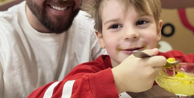 Также он показал фотографии с сыном. На одной из них Лукьян, одетый в ярко-оранжевую толстовку, с улыбкой ест мороженое. Губы у мальчика перепачканы десертом. В руках он держит ложку с кусочком лакомства. За спиной у ребенка видна украшенная новогодняя елка.