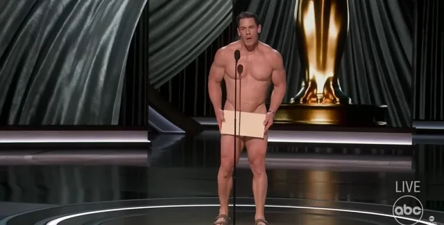 Американский актер и рестлер Джон Сина эпатировал публику на церемонии вручения премии "Оскар", появившись на сцене абсолютно голым. В таком виде он объявил победителя в номинации за лучший дизайн костюм.