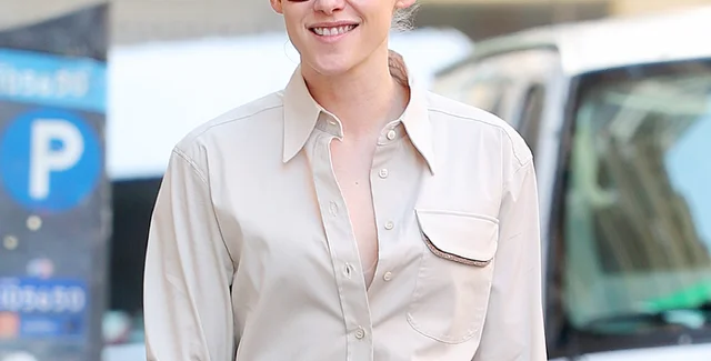 Смелый образ Кристен состоял из ультрамаленьких трикотажных трусиков, похожих на нижнее белье, и соответствующего цвета рубашки с длинными рукавами. На ней были колготки телесного цвета и бордовые туфли-лоферы с маленькими кисточками из лакированной кожи, которые сочетались с ее броским нарядом. Голливудская звезда дополнила свой образ красно-коричневыми солнцезащитными очками и блестящей черной сумкой Chanel. Из украшений на ней было несколько колец.