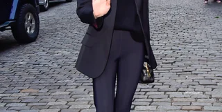 Под пиджак она одела черную трикотажную кофту и темно-синие спортивные леггинсы. Образ знаменитость завершила черными солнцезащитными очками, кожаной сумочкой, массивными черными лоферами и белыми носками.
