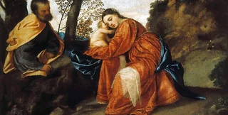 "Отдых на пути в Египет" была написана Тицианом Вечеллио в 1512 году. На картине изображены Иосиф, Мария и Иисус, останавливающиеся передохнуть во время путешествия.