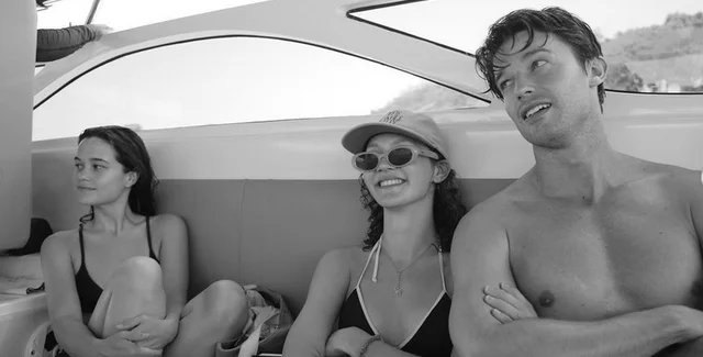 30-летний актер продемонстрировал свою спортивную форму на черно-белых фотографиях, опубликованных его коллегой по фильму Сэмом Ниволой в Instagram. На первых фотографиях актер сидит без рубашки на носу лодки с 21-летней актрисой Айрис Апатоу. Актер "Лестницы" был одет в плавки и держал в руках бутылку воды. Апатоу в бикини с завязками и мокрыми волосами, собранными в свободный пучок, сидит рядом с Патриком.