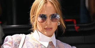 Джей Ло собрала свои длинные пряди в тугой пучок и демонстрировала вишневый маникюр. Артистка сделала минимальный макияж и отказалась от украшений.
