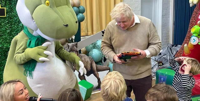 Малыш позировал с аниматором в костюме динозавра. А Борис Джонсон с женой также не упустили возможности сфотографироваться с зеленым "динозавром".