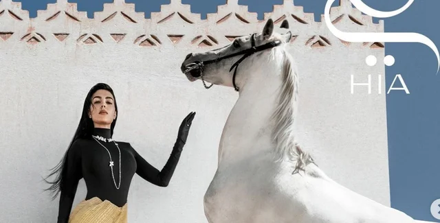 На обложке мама двоих детей предстала с белым арабским скакуном. Джорджина примерила черную водолазку и длинную плиссированную золотистую юбку.