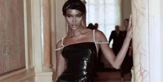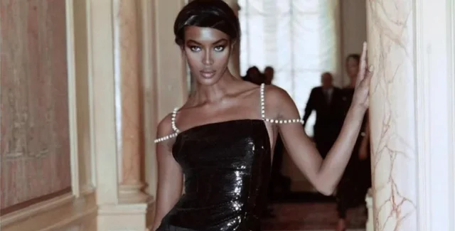 Ранее супермодель надевала платье на модный показ Chanel осень 1996. Платье в пол имеет черный лиф с блестками, который держится на лямках из нитей жемчуга, которые накинуты на ее плечи. Полосатая юбка-русалка платья покрыта такими же черными пайетками, которые чередуются с рядами прозрачного черного фатина. В то время как Наоми Кэмпбелл надевала платье поверх черного слипа на подиуме в 90-х, она решила отказаться от него в 2024 году, просто надев под наряд черное нижнее белье.
