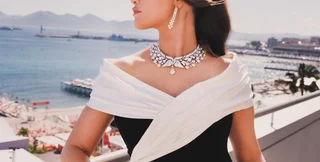 На фото звезда позирет в черном облегающем бархатном платье-футляре Saint Laurent с драпированным белым атласным вырезом, элегантно обвивающим ее плечи. С помощью стилиста Эрин Уолш Гомес усилила классический образ кинозвезды своего ансамбля с помощью замысловатого бриллиантового колье-воротника, а также свисающих бриллиантовых сережек Bulgari. В руках у нее был небольшой черный клатч.