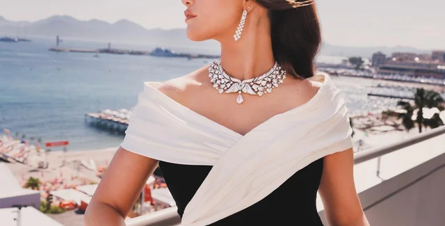 Селена дополнила наряд очень красивым колье-воротником с бриллиантами.
