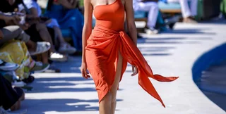 А бренд Eau Swimwear представил цельные купальники красного, розового, зеленого и синего цветов с открытыми плечами и частично оголенным животом. Модели Eau также носили туфли на шпильке с ремешками и аксессуары, в том числе соломенные сумки, идеально подходящие для пляжного отдыха, солнцезащитные очки, платки и саронги.
