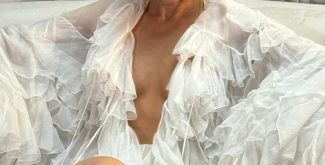 На снимках знаменитость позирует в белом платье-халате из летящей ткани от Chloe, со множеством оборок и глубоким вырезом, под которым нет нижнего белья. Лопес сидит на диване, закинув ногу на ногу, и дерзко смотрит в камеру. Ее волосы собраны в прическу, а образ завершают бежевые босоножки на массивной платформе и не менее массивном каблуке, золотой браслет и бриллиантовые серьги.