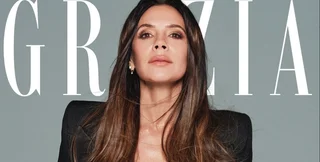 На обложке Grazia можно увидеть жену Дэвида Бекхэма, которая демонстрирует свое подтянутое тело, надев кружевной бюстгальтер под расстегнутый блейзер.
