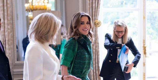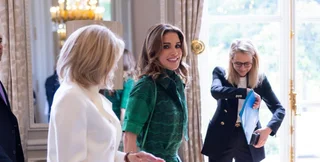 Для появления во французской столице королева Иордании выбрала изумрудный элегантный наряд.