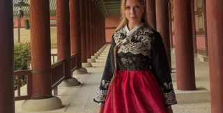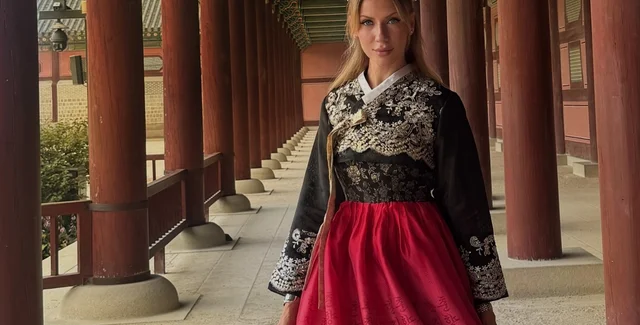 На Лесе – черное чогори, отделанное белыми узорами, и красно-черно-белая юбка с иероглифами с полупрозрачным красным верхом. Она позирует на фоне храма, демонстрирует роскошные пейзажи и даже сфотографировалась с несколькими корейцами в национальной одежде и показала девушек в праздничных нарядах.
