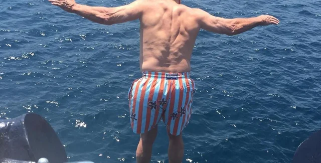 На первом фото было показано, как звезда "Таксиста" в красно-голубых полосатых плавках прыгает с яхты. Вторым шел короткий видеоролик, который показывает сам процесс.