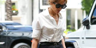 Лопес надела серый свитер на белой футболке и мешковатые джинсы из денима синего цвета с "грязными" пятнами на них. Образ дополняли коричневые ботинки на массивной подошве, солнцезащитные очки, золотые серьги-кольца и черная сумочка. Волосы она гладко зачесала и собрала в пучок сзади.