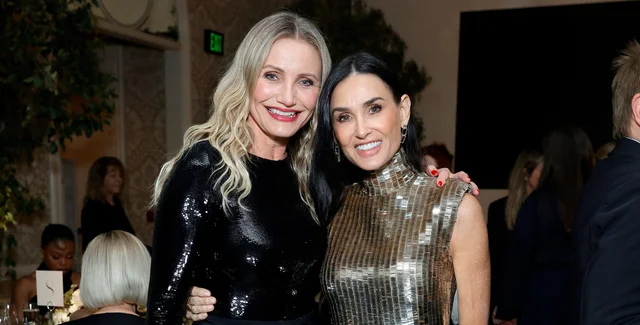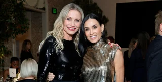 62-летняя Деми Мур посетила мероприятие ELLE в ослепительном облегающем вечернем платье без рукавов с халтер-воротником от Ralph Lauren. Наряд напоминал диско-шар, а золотой цвет делал его еще более гламурным.
