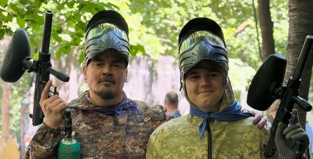 В кадре Фагот и его ребенок стоят в защитных костюмах и шлемах. В руках они держат пейнтбольные маркеры, поднятые кверху. Отец положил руку сыну на плечо.