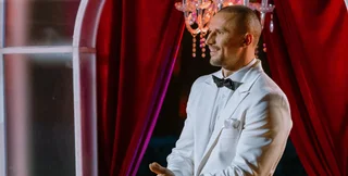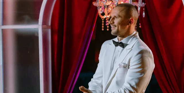 Главный герой предстал на вечеринке в белом пиджаке, рубашке и черных брюках. Образ дополнили черные туфли и бабочка.