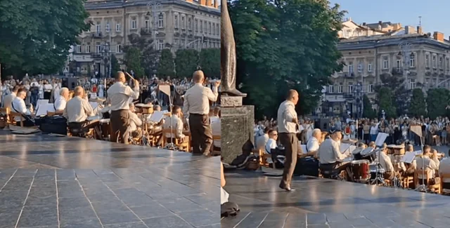 Судя по подписям, зажигательный танец произошел на благотворительном концерте под открытым небом. Оркестр выступал возле памятника Тарасу Шевченко, недалеко от Оперного театра во Львове.
