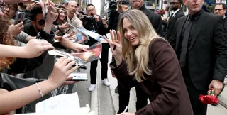 Звезда фильма "Мария" выглядела заметно тронутой теплым приемом поклонников и была сфотографирована, когда махала фанатам.