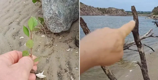"Показываю эксклюзив. На Хортице, кто в Запорожье, тот знает, есть деревья, которые раньше были под водой. Вот это было дно реки. Каховская ГЭС была взорвана, вода после этого спала. Появились эти деревья, которые были под водой 70 лет. Вот они здесь торчали два года и проросли. Оно живет. 70 лет было на дне, но жизнь берет свое", — рассказывает автор видео за кадром.
