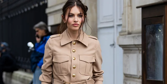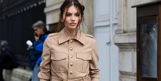 Модель демонстрировала шикарный образ в бежевой куртке в стиле милитари и брюках с высокой талией, стоя с улыбкой на улице перед показом женской коллекции Zimmermann Весна/Лето 2026 на Неделе моды в Париже.