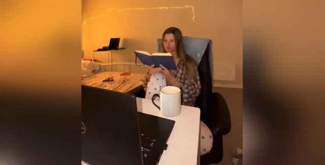 Вечером женщина посвящает время изучению норвежского языка, чтобы легче адаптироваться к жизни после переезда.