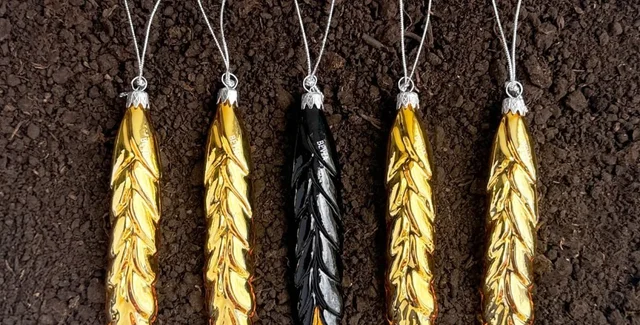 В набор вошли пять елочных украшений в форме колосков: четыре золотые и один черный ("обожженный"). В BEVZA отметили, что они символизируют "силу земли, труд рук и свет, который сохраняется даже в темные времена" и "олицетворяют возрождение, надежду и единство поколений".