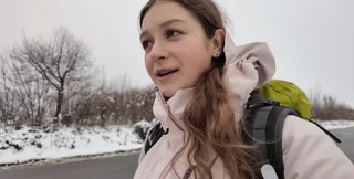 "Я иду пешком из Львова в Черновцы. Это первый день моего похода. Стартую от Оперного театра. Сегодня должен пройти 20 км. Первая моя точка — это Пустомыты. Выпал снег, поэтому мой осенний поход превратился в зимний", — рассказывает девушка.