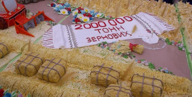 Торт изготовили в виде пшеничного поля, а символами запорожских хлеборобов стали фигурки комбайнов и грузовых автомобилей.