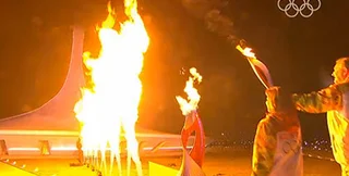 Факел к чаше на стадионе "Фишт" поднесли трехкратный олимпийский чемпион, президент Федерации хоккея России Владислав Третьяк и трехкратная олимпийская чемпионка по фигурному катанию Ирина Роднина, пишет Лента.ру.
