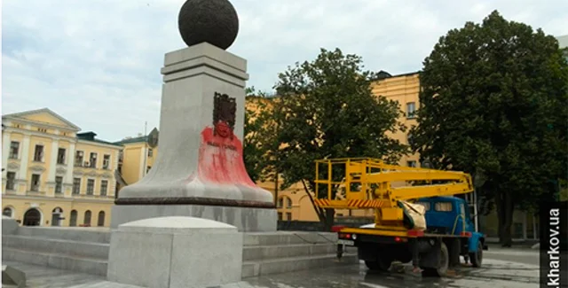 Сотрудники КП "Харьковзеленстрой" обнаружили это обнаружили краску на монументе около 7:00, придя на работу, сообщает пресс-служба Харьковского горсовета.