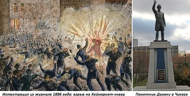1 мая 1886 года в США и Канаде прошли рабочие выступления (забастовки и демонстрации) с требованием 8-часового рабочего дня, организованные анархистами (об этом последнем весьма важном моменте марксистские историки как правило умалчивали). 3 мая в Чикаго у проходной завода жаток Сайруса Маккормика произошло столкновение забастовщиков со штрейкбрехерами, охранявшимися полицией. Полиция открыла огонь, было убито до 6 рабочих. На следующий вечер по призыву анархистов, на фешенебельной площади Чикаго Хаймаркет-сквер состоялся массовый митинг протеста. Уже затемно на площадь явился отряд полиции и приказал очистить ее. Выступавший в этот момент с весьма резкой речью анархист Филден возразил, что это – мирное собрание. И тут кто-то из толпы кинул в полицейских бомбу. Она убила на месте одного полицейского Мэтью Дегана и смертельно ранила шестерых. Полицейские открыли огонь по толпе, из толпы отвечали стрельбой из револьверов, но затем толпа быстро разбежалась, оставив нескольких убитых.