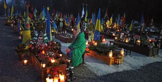 Это выглядит как мистическое кино, но это жизнь. То есть смерть. Нет, все-таки жизнь. Вечная жизнь, обретенная в бою. Львов. Лычаков. Вечер. 245 могил за оградой большого кладбища. На могилах и над ними, словно витают души — огоньки, фонари, гирлянды, горы цветов. И кресты, флаги, флаги, снова флаги, улыбающиеся ребята на портретах.