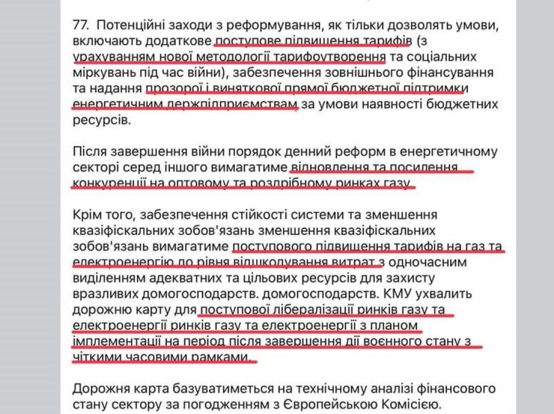 В тексте 77-й статьи Меморандума с МВФ, которая как раз касается энергетических рынков и тарифов, четко прописано о повышении тарифов. Обратите внимание на ключевые фразы: