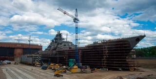 Второй старый крейсер "Адмирал Нахимов" стоит у причала верфи "Севмаш" в Северодвинске, на севере России, с 1999 года. Фарсовая история с его планируемым возвращением в строй свидетельствует о широчайшем военно-морском упадке России.