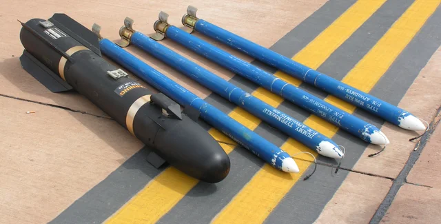 Эти ракеты апгрейджуються благодаря системе APKWS. Если коротко, то в ракету в центр имплементируется модуль с крылышками, который делает из неуправляемой ракеты — управляемую, по лазерному наведению. На скрине показано как в центр ракеты устанавливают модуль управления, и как ракета выглядит после установки.