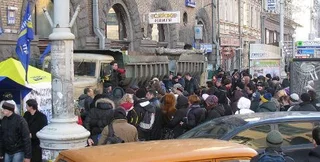 Провести эту акцию в помещение сейчас невозможно: магазин забаррикадирован, окна наглухо заварены, а возле входа, просто на тротуаре, легендарное "Сяйво" заслоняют огромные грузовики.