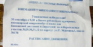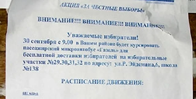 В Харькове вывешены объявления Партии регионов, в которых дано расписание движения автобуса, призванного бесплатно доставлять избирателей на избирательные участки города.