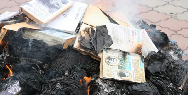 Во время митинга активисты ПСПУ сожгли учебники по новейшей истории Украины.