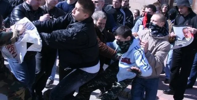 Когда две группы сошлись вместе, атаман местного казачества вырвал из рук тягнибоковцев плакат и разорвал его. Возникла потасовка, в которой принимали участие около 20 человек. В ходе словесной перепалки с одной стороны звучали выкрики: "Бандеровцы!", "Фашисты!", "Скоты!" С другой, им в ответ: "Комуняку - на гілляку!", "Героям - слава!"