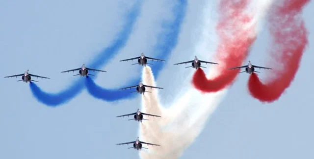 "Патруль де Франс" - знаменитая французская пилотажная группа, использующая на самолетах генераторы дыма (белого, синего, красного). Летает под музыку различных исполнителей. Обычно состоит из 9 самолетов.