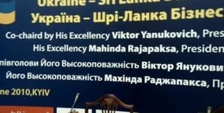 Позади мест, где разместились президенты обеих стран, расположен плакат с надписью: "Його Высокоповажність Віктор Янукович" та "Його Высокоповажність Махінда Раджапакса", сообщает ИМК.