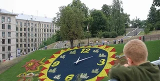Через две недели цветочные часы в центре Киева изменятся. Если сейчас они сделаны в виде ордена Победы, то скоро будут в национальном стиле: циферблат - флаг, а вокруг калина, рушник и колоски