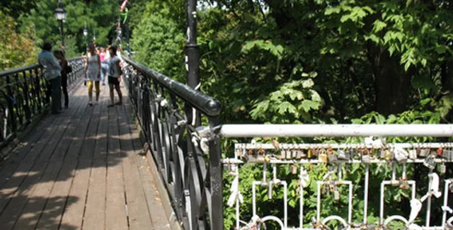 30-метровый пешеходный Парковый мост или Мост влюбленных находится над Петровской аллеей в Крещатом парке. Мост сооружен по проекту Евгения Патона и открыт 22 ноября 1910 года. В теплое время года чрезвычайно популярен у свадебных кортежей из-за открывающихся видов на Днепровские склоны. Пары часто в знак вечной любви оставляют на перилах моста ленточки и замочки.