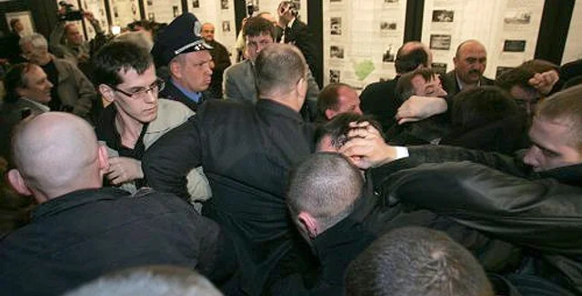 8 апреля в "Украинском доме" корреспондент Сергей Кутраков, выполняя редакционное задание, проводил съемку сюжета об открытии фотовыставки "Волынская резня: польские и еврейские жертвы ОУН УПА". Его внимание привлекли люди, выкрикивавшие националистические лозунги, которых охранники начали выводить из зала в коридор служебного выхода.