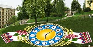 Часы выполнены в виде украинского вышитого рушника. Композиция гармонирует с тематикой 55-й юбилейной выставки цветов "Река вышиванок", которая откроется в Киеве ко Дню независимости.