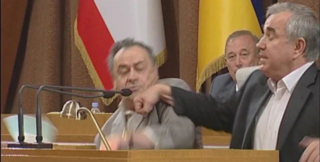 В итоге этой словесной перепалки Захаров подбежал к Фиксу и применил силу. Из зала раздались крики: "Позор!". После минутной потасовки депутатов стал разнимать их коллега от фракции "Курултай–Рух" Леонид Пилунский.